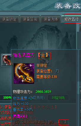 从紫装开始装备开始有了五行的属性,五行属性相同可以激活灵魂锁链属性,灵魂锁链属性是装备中特有的属性,此属性在战斗起到了非常大的作用,能否称霸武林,就靠它了。