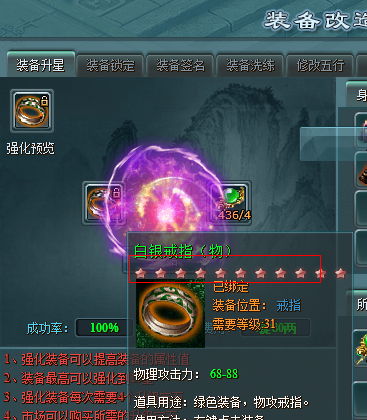装备强化以后可以增加装备的基础属性值,而且增加了星星效果,13星以后有特殊属性和效果。