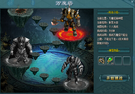 万魔塔不可返回低层进行挑战,每一层都有不同的物品掉落。玩家挑战到68层,要继续往下挑战就要满足等级135级的限制才可以继续往下挑战。