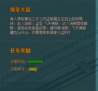 找到大剑师之后就可以接缉拿大盗的任务了, 缉拿大盗可以获得海量的经验和银子奖励,勇士你敢去帮助我缉拿盗圣飞天神鼠么,飞天鼠就藏在山外山哦。