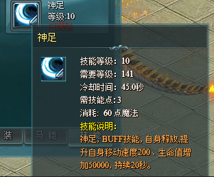 神足是战士资料片中新加入的技能战士神足技能,最高可以提高自身移动速度+200,生命增加50000点,持续时间20秒!瞬间到达敌人的面前,给敌人来个措手不及,真的是爽翻了。