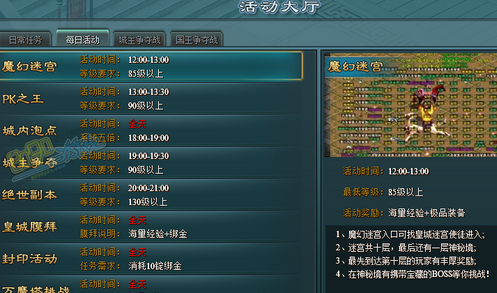 魔幻迷宫每天12:00~13:00开启,需要玩家等级85级以上方可参加。参与魔幻迷宫的玩家可以获得海量经验和极品装备的奖励。每层的迷宫是固定的,玩家走两边基本上就能级的很清楚了,BOSS还是很简单的,转阶段的时候注意躲好技能就好了。