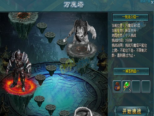 万魔塔中只出紫色极品装备。玩家要是打败不了BOSS了,那么进来进阶翅膀、宝宝、坐骑吧。