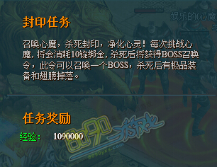 玩家去王城雕像处接封印心魔任务,接受任务后雕像旁会有心魔,玩家杀死这个心魔,获得BOSS令和1090000经验的奖励。