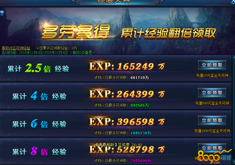 | 11月30日 | 红装材料任选*500,王者修为丹*3,1000元宝*1,魔煞石*200,钻石5武器首饰任选,钻石5防具任选*1 | 消费5000元宝 |