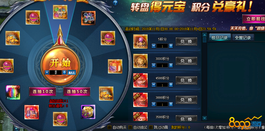 活动内容:活动期间,活动期间,玩家可通过充值获得兽首转盘次数,转动转盘可获得兽首奖励。