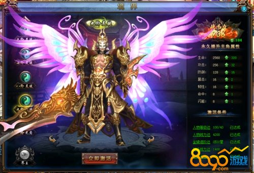 境界界面显示角色模型、境界属性、境界战斗力、激活条件。