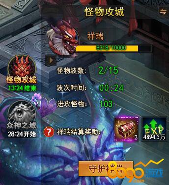2. 当活动开启后,朝歌会出现3个传送门,传送门会每分钟涌入小怪、精英和boss攻击祥瑞,怪物总共有15波。