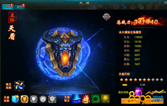 3. 天盾升阶会激活5个被动技能,可消耗天盾技能书对技能进行升级。