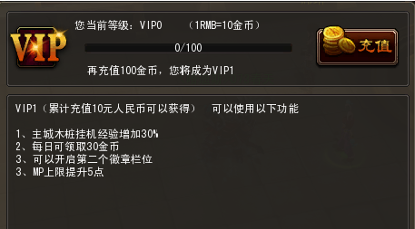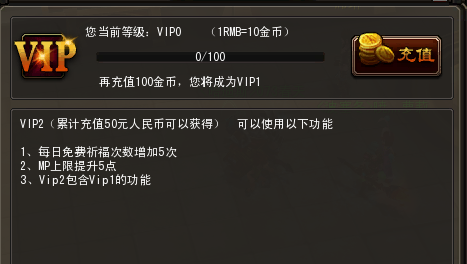 惊天战神新版本VIP可以说是真的物有所值了,取消了攻击力的加成,增加了低等级VIP的福利,VIP1就可以增加伐木工作30%的经验,每日领取30个金币。可以说10块钱也可以玩的进行了。VIP3每日多五次免费祈福的机会,开启祈福10倍暴击系统,每日免费领取药品,每日领取40金币,充值100元就可以获取以上福利。当对来说高等级的VIP没有太大的福利,应该在日后的改版中回有新的福利增加。