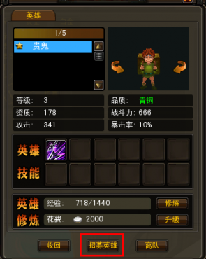 点击招募英雄进入招募页面。英雄的招募是有前提条件的,钱是必须的一个方面,其次就是对战斗力的要求,战斗力越高才能招募到越高级的英雄。
