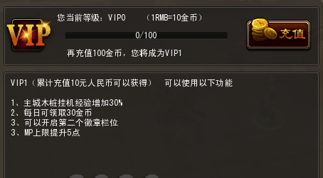 惊天战神新版本VIP可以说是真的物有所值了,取消了攻击力的加成,增加了低等级VIP的福利,VIP1就可以增加伐木工作30%的经验,每日领取30个金币。可以说10块钱也可以玩的进行了。VIP3每日多五次免费祈福的机会,开启祈福10倍暴击系统,每日免费领取药品,每日领取40金币,充值100元就可以获取以上福利。当对来说高等级的VIP没有太大的福利,应该在日后的改版中回有新的福利增加。