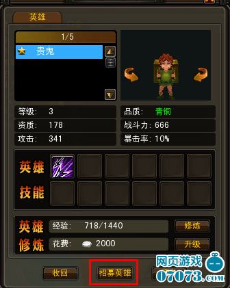 点击招募英雄进入招募页面。英雄的招募是有前提条件的,钱是必须的一个方面,其次就是对战斗力的要求,战斗力越高才能招募到越高级的英雄。