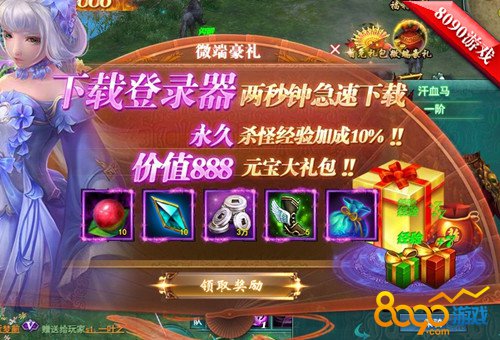 首先玩家只需要下载登录器,就可以获得永久杀怪经验加成10%,还有价值888元宝的豪华大礼等你来拿,其中包括饲骑丹,青金铭石,传送靴和银两,是不是很诱人呢,只需两秒,小手抖一抖,极品全都有!