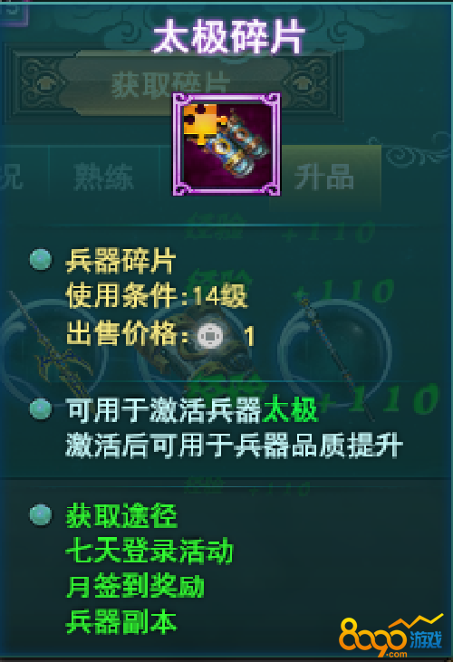 太极作为主线剧情送的武器,上手无任何难度,装备升品所需要的碎片也容易得到,可以在前期便拥有极强的战力,前期打BOSS和活动非常给力。