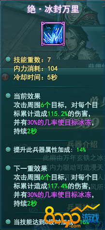 玄冰的技能如同它的外型一般有着不俗的效果,它的绝技 绝·冰封万里 能够对身边的敌人造成大量的伤害同时有概率造成冰封效果,是一把不可多得的好神兵,绝对值得玩家培养。