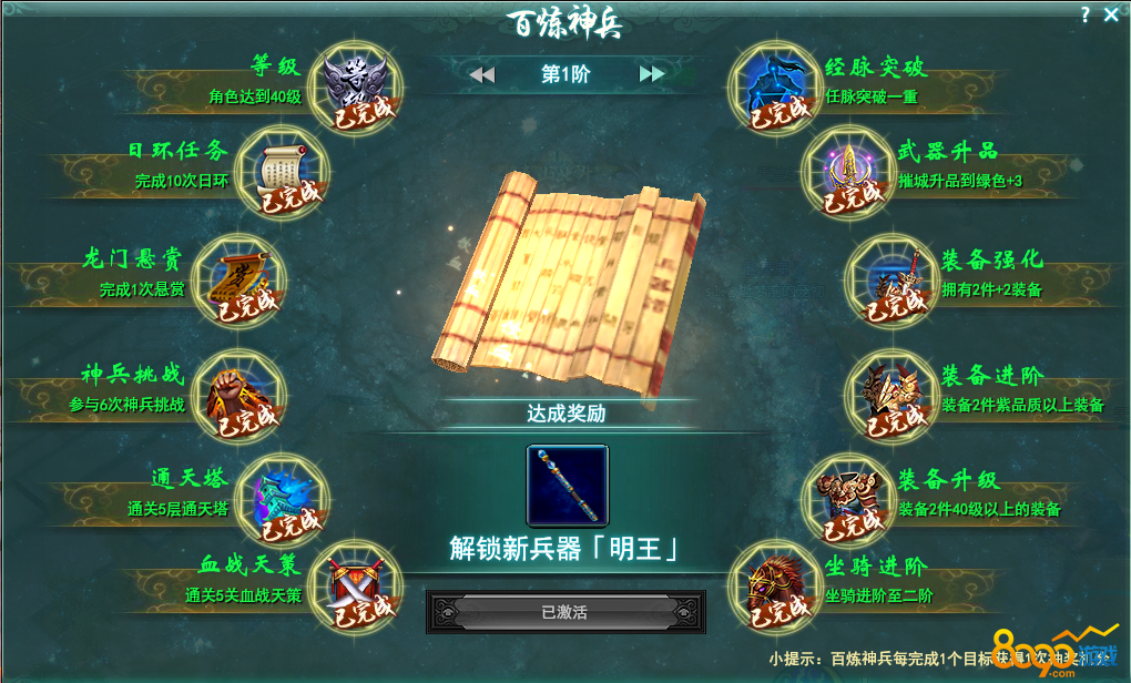 百炼神兵第一阶如图,完成可以解锁神兵明王,是前期升级打怪不可多得的神器。