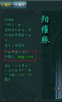 打通经脉需要元气,经脉除了加大量属性外,还能提高增加总属性的BUFF,例如:小周天阳维脉全通提功攻击2%的加成。人物和装备的属性越高,经脉提供的加成也越高。