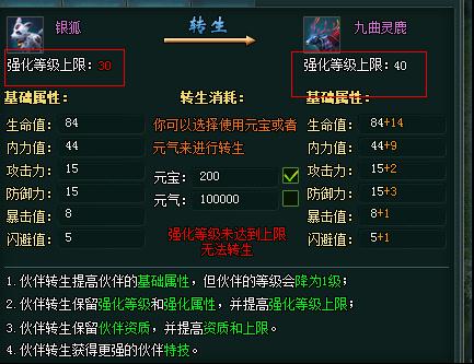 宠物强化到上限后可以转生,转生提高宠物的强化上限和资质上限,同时提高宠物的基础属性(初始属性),获得更强的特技。同类同品质的宠物资质上限和基础属性都是完全相同的。