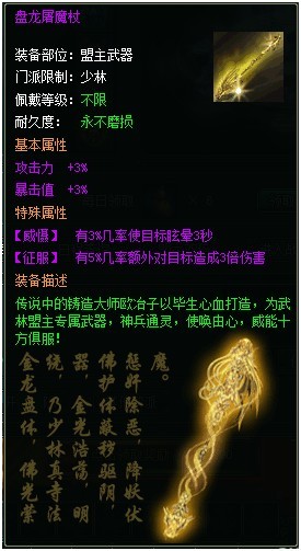 1、 专属武器,每周盟主争夺战前系统将会暂时收回上一届武林盟主的专属武器;