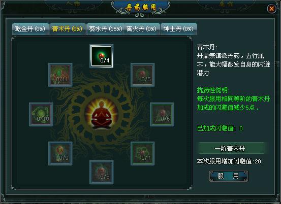 五种不同的丹药对应五种人物属性,分别是攻击、闪避、生命上限、暴击、防御,每种丹药都有服用次数上限,每次服用相当的丹药都会降低该药品的服用效果。