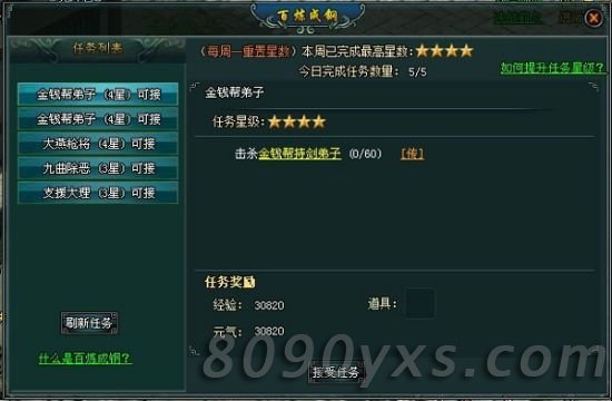 高星级百炼任务是每位剑侠奇缘玩家梦寐以求的,也可以帮助玩家更快地提升等级并为玩家提供大量强化装备与宠物、打通经脉必备的元气。百炼成钢任务星级将每个星期重置一次,所以,如果刷出了高星级任务,玩家一定要尽快完成哦!日积月累、百炼成钢,你成为武林第一高手那一天指日可待!