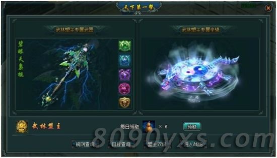 当然,剑侠奇缘武林盟主争夺战不仅仅能给与玩家精神上的优越感,在物质上的奖励也是相当丰厚的哦!武林盟主将会获得独有的专属武器及专属坐骑——八卦玉龙台。盟主专属武器上将拥有其他装备都不具有的特殊属性“威慑”和“征服”,造型大气,散放着莹莹光辉。武林盟主专属武器及专属坐骑会在每周盟主争夺战前由系统暂时收回。