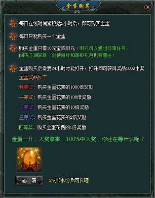 当你成功购买了金蛋后,金蛋购买界面里的金蛋会从原本灰暗的状态变得闪闪发光。不过,大家可不要太心急哦,购买金蛋后,玩家需要在24小时后才能进行砸金蛋,这二十四个小时孕育与等待财富的时间,还真是显得格外漫长呢!剑侠奇缘砸金蛋玩法100%中奖,最高可以获得购买金蛋花费1000倍的奖励哦!即便不中也没关系,只要是金蛋砸开就一定有奖,最低奖也是购买金蛋的费用,稳赚不赔,绝对是一锤定音绝不落空!