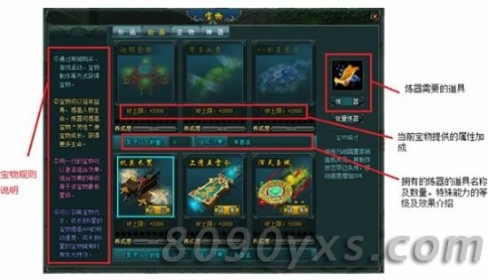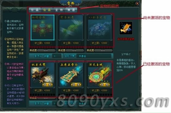 宝物有品质之分,由低到高分为珍品、仙品、圣物、神器四个品质,只有激活6个前一级品质的宝物,下一级品质的宝物才能够激活。想要获得更多属性加成,则需要通过炼器,炼器需要使用炼器道具“上清符”,当道具不足的时候也可以使用元气炼器,以此来提高宝物灵性。当灵性达到升级需求,宝物星级将提升1级,每种宝物的星级都分为10星。