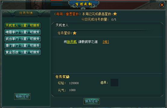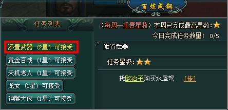 任务简介:百炼成钢任务分为为1-10星,每周日晚12点重置,玩家每完成一个任务就会刷新当前所有任务,并有概率刷出比当前最高星数高一颗星的任务,最高可以积攒到10星。
