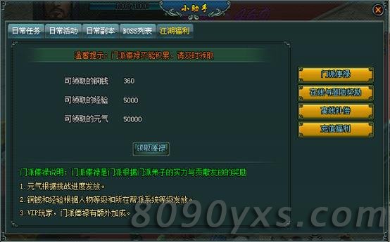 江湖福利介绍:只有实力高强、名声在外的江湖高手才能享受本门派的俸禄,而实力的最直接体现,便是他在无双挑战的战绩!当然,为了鼓励学艺未精的弟子勤加历练,各大派掌门每天也会发放一定的物资,供门下弟子们使用。 如何领取: