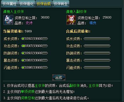 1、合成消耗副宠物提高宠物的资质,合成后主宠物降为一级。