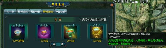有帮派的玩家每天可以在帮派活动界面进行3次祭酒,祭酒可以获得大量的元气奖励,元气奖励和祭酒的规格、人物等级、帮会等级有关,等级越高,获得的元气数量越高。