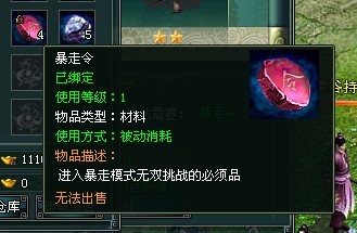 暴走令《剑侠奇缘》无双挑战系统中的每一位侠士还有两种挑战方式——普通模式和暴走模式,暴走模式中的侠士战力比普通模式更高,挑战难度更大,但获得的物品、元气、经验奖励及属性加成都比普通模式更多。挑战暴走模式的侠客除了需要消耗挑战次数之外,还需要消耗道具“暴走令”,一次暴走模式的无双挑战消耗一个暴走令。暴走令可以在日常任务中获得,也可以在商城购买。不过,还是那句话,当自己的战力达到系统推荐战力要求之后玩家再进行暴走模式的无双挑战不迟哦!