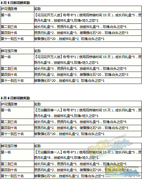 【活动内容】在活动期间,玩家通过赠送鲜花与收取鲜花获得魅力值,登上护花情圣榜(男生排行榜)与宝贝鲜花榜(女生排行榜),排名在前50名的玩家可以获得丰厚奖励!活动奖励将会在次日凌晨通过邮件发放。