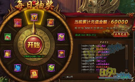 【活动内容】活动期间,玩家每充值300元宝即可获得每日转盘次数一次,转动转盘即可获得各种珍贵道具,赢取坐骑幻化材料、高级宝石和极品传奇装备!