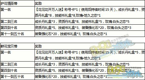 【活动内容】在活动期间,玩家通过赠送鲜花与收取鲜花获得魅力值,登上护花情圣榜(男生排行榜)与宝贝鲜花榜(女生排行榜),排名在前50名的玩家可以获得丰厚奖励!活动奖励将会在次日凌晨通过邮件发放。