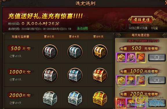 【活动内容】活动期间,玩家充值指定金额即可获得充值大奖,累计充值天数与充值元宝数均达到对应的要求,即可领取累计充值奖励。
