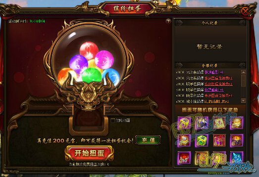 【活动内容】在活动期间,玩家每充值200元宝即可获得扭蛋机会一次,从彩蛋中玩家可以获得各种珍贵的道具、绝版时装礼包。神秘大奖,等你来拿!