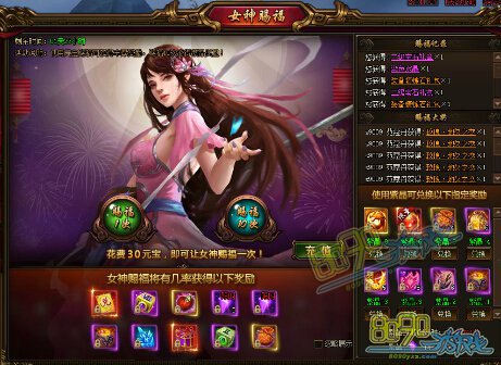 【活动内容】活动期间,女神携福降临,玩家花费30元宝可以获得女神赐福一次,有机会得到传奇装备兑换券,顶级宝石,更能获得珍贵紫晶,兑换幻形精魄、元魂珠等珍稀道具,机不可失时不再来!