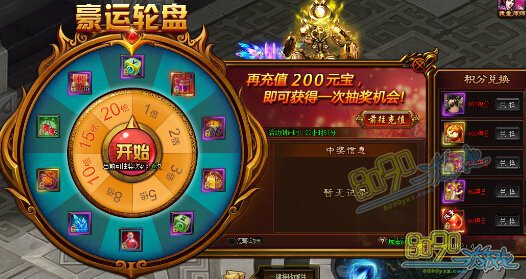 【活动内容】活动期间,玩家每充值200元宝即可获得一次豪运轮盘的机会,享受20倍的惊喜,珍贵道具等你来拿!