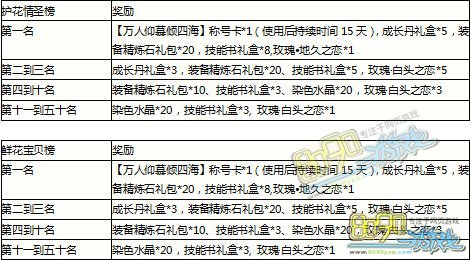 【活动内容】在活动期间,玩家通过赠送鲜花与收取鲜花获得魅力值,登上护花情圣榜(男生排行榜)与宝贝鲜花榜(女生排行榜),排名在前50名的玩家可以获得丰厚奖励!活动奖励将会在次日凌晨通过邮件发放。