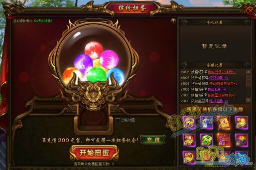 【活动内容】在活动期间,玩家每充值200元宝即可获得扭蛋机会一次,从彩蛋中玩家可以获得各种珍贵的道具、绝版时装。神秘大奖,等你来拿!