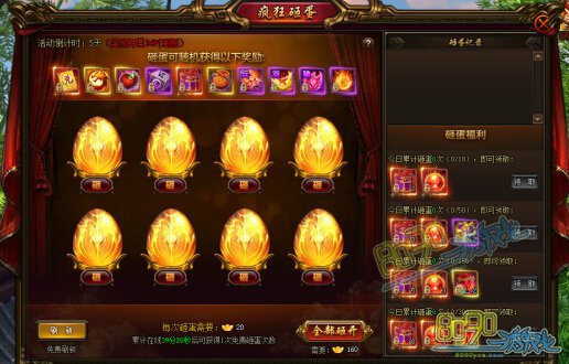 【活动内容】活动期间,玩家可以在活动界面砸金蛋,赢好礼,各种珍贵道具收纳囊中!更有机会砸到七彩金蛋,获取神秘好礼!