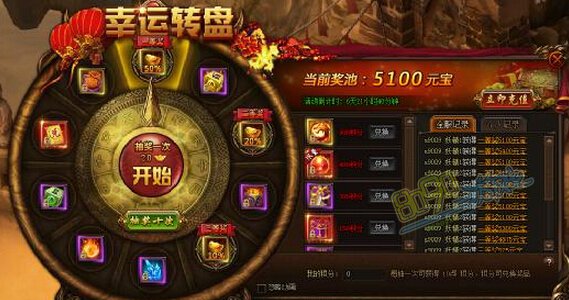 玩家每次转动转盘,都会有5元宝累计作为奖池奖金,每次转盘均有机会获得奖池百分比的奖金及珍贵道具