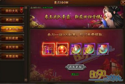 活动内容:活动期间,只要全服回归老玩家人数达到指定数目,全服等级大于等于75级的玩家即可在指定时间内领取丰厚奖励如传说秘卷礼盒、装备精炼石、元魂珠等珍贵道具。喜迎故友归,全服同赠礼!