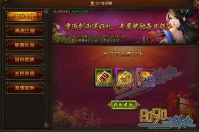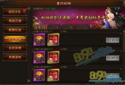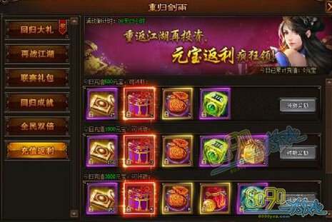 活动内容:活动期间,回归老玩家每日充值元宝达到指定数量,即可获得高比例的元宝返利,同时还有高级宝石、传说秘卷礼盒、成长丹礼盒、装备精炼石等珍贵道具相送。增强实力,再战江湖!