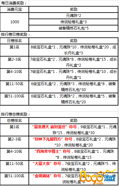 【活动内容】活动期间,每日消费达到1000元宝的玩家,即可获得丰富道具奖励。消费5000元宝以上的玩家即可参与日榜以及总榜的竞逐,赢取绝版称号、传说礼盒等珍贵道具!