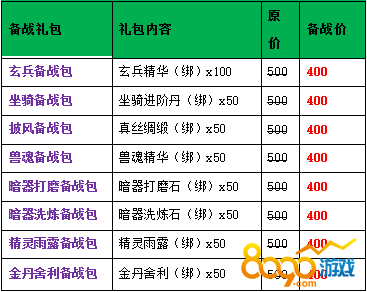 活动期间,玩家可在【精彩活动 界面】8折的超优惠价格,购买到比武备战礼包(不限购买数量),庆祝九阴武斗会即将开赛,备战礼包特惠仅此一次,不容错过。