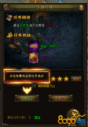 玩家可以通过江湖告示板接受江湖行侠任务,一定要刷到满星再接受,这样能够最大化的获取奖励,最近更新后,玩家在刷新时不会消耗铜钱,不知道下次更新会不会改掉,这也算是给玩家的福利,好好利用哦。